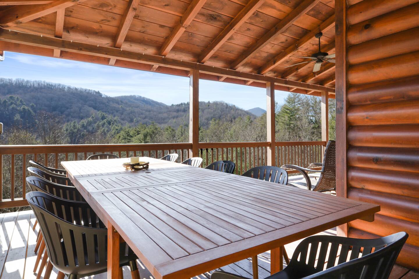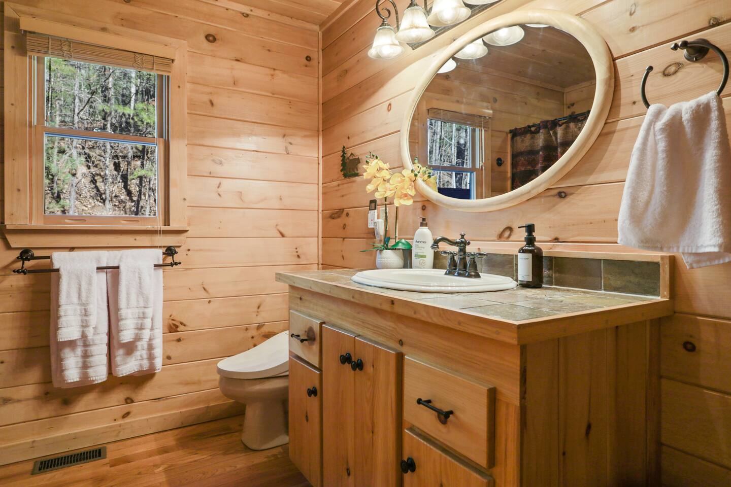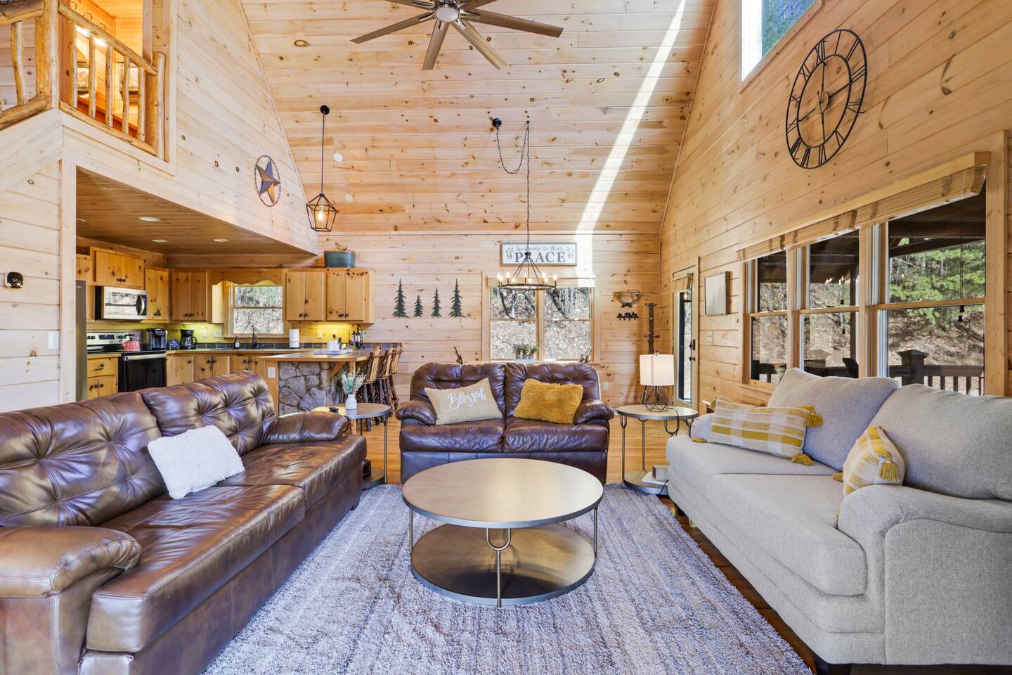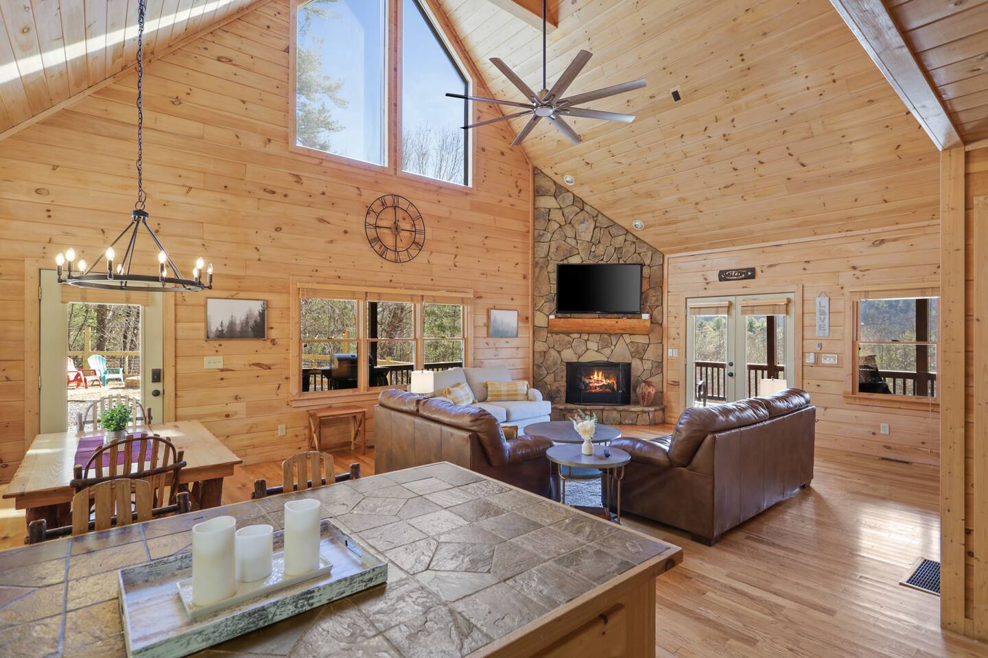 The cabin has three floors and three full bathrooms (one on each floor) stocked with shampoo/conditioner/body wash as well as towels and a hair dryer. The top floor includes two bedrooms, one with a king bed and private porch with seating area overlooking a beautiful view of the mountains, the other with a queen bed. The main floor has one bedroom with walkout to the main deck space that also faces the mountains. In the basement, we have a bunk room that has two bunk beds: one twin over full bunk and one twin over twin bunk. We have two outdoor fire pits: one is wood-burning, and the other is gas-powered. Guests are required to provide their own firewood. However, we are more than happy to coordinate firewood delivery to the property for you upon request. The basement boasts a fooseball table, card table, big screen TV with PlayStation 3 (games included), several board games, and a stand-up arcade game that includes 14 games. It also has access to the bottom deck, which includes a six seat hot tub, gas powered fire pit, and extra seating to take in the views. Fully-stocked kitchen for all your cooking needs. Gas grill with gas line, so you’ll never have to worry about an empty propane tank. Crock pot, two drip coffee makers, one Keurig, blender, food processor, skillet, kid’s plates/cups, and pots/pans/roasting trays aplenty. The cabin is dog-friendly. We have an outdoor dog run that is fenced-in for your furry friend's restroom needs. Additionally, dog bowls, leashes, and poop bags are provided for your use while staying with us. All TVs are equipped with Roku devices that include YouTube TV for your basic cable needs, as well as Netflix, Disney+, Hulu, Amazon Prime, Apple TV+, ESPN+, and Paramount. For the outdoor enthusiasts, take your pick from hiking/biking/kayaking/canoeing to world-class trout fishing-all within a few miles. Less than 3 miles to the beautiful Toccoa Riverside restaurant, Toccoa River tubing, and a family fun center that offers putt putt. Only one mile from the popular hiking trail that ends at a waterfall, Fall Branch Falls. The Benton Mackaye Trail can be accessed within a mile of the property as well. Close proximity to both downtown Blue Ridge and Ellijay. Several wineries nearby. Please note that the road leading up to the property is paved, but is narrow and can be steep in places. While we have not had an issue with sedans, vans, or trucks, we do not recommend traveling to the property with any vehicle that has low clearance (like a sports car).